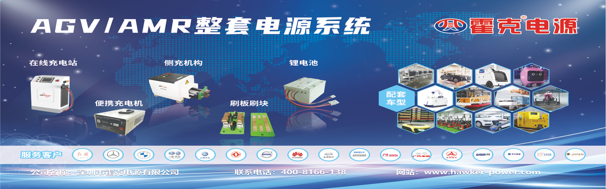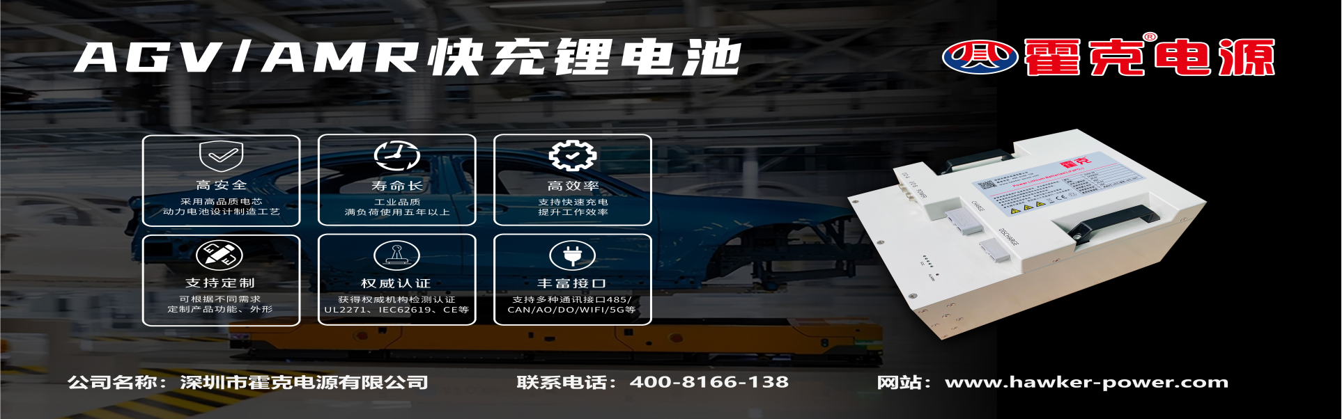 深圳市霍克電源有限公司是專注于移動(dòng)式機(jī)械(包括機(jī)器人)動(dòng)力電源和分布式儲(chǔ)能電源的研發(fā)、制造和服務(wù)的專業(yè)企業(yè)。其“霍克?”品牌的鋰電池、鉛酸電池、充電和接電設(shè)備歷來(lái)在行業(yè)內(nèi)口碑優(yōu)良,“霍克?”商標(biāo)更是行業(yè)內(nèi)的馳名商標(biāo)。公司下設(shè)有鋰電池及充電設(shè)備生產(chǎn)工廠和鉛酸電池及充電設(shè)備生產(chǎn)工廠。多年來(lái),秉承“超越自我,追求卓越”的傳統(tǒng),不斷加大研發(fā)投入,為用戶提供了滿足各種不同使用要求的從設(shè)計(jì)、制造到安裝、調(diào)試的解決方案和定制化產(chǎn)品,“霍克?”電源產(chǎn)品具有先進(jìn)的自我管理、通訊、安全保護(hù)和快速充電等完備功能,滿足了用戶對(duì)電源設(shè)備使用的更新、更高的要求。目前“霍克?”品牌的各類電源產(chǎn)品已在大型汽車(chē)生產(chǎn)企業(yè)、大型AGV生產(chǎn)企業(yè)等得到廣泛的應(yīng)用。我們的目標(biāo)就是為各領(lǐng)域用戶提供更加完善而先進(jìn)的電源解決方案和定制化產(chǎn)品。